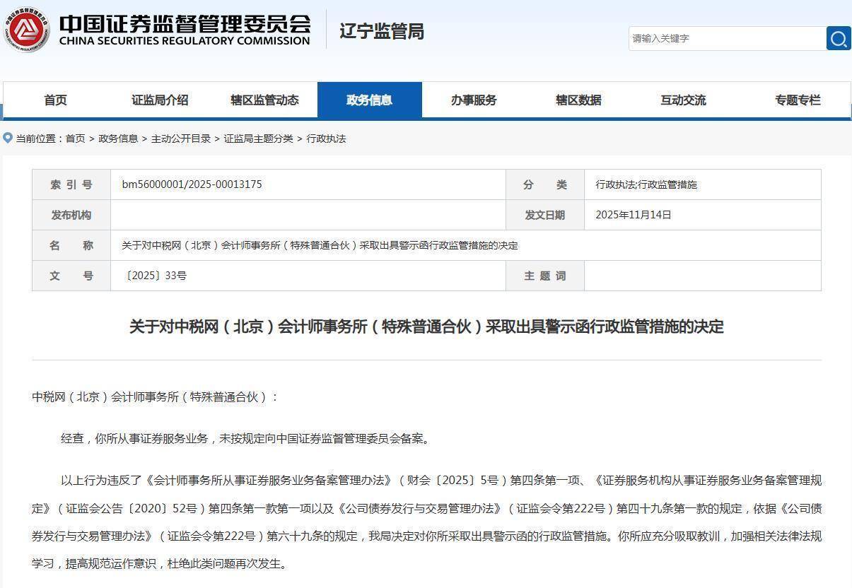 决定称,经查,中税网(北京)会计师事务所从事证券服务业务,未按规定向中国证券监督管理委员会备案。以上行为违反了《会计师事务所从事证券服务业务备案管理办法》(财会〔2025〕5号)第四条第一项、《证券服务机构从事证券服务业务备案管理规定》(证监会公告〔2020〕52号)第四条第一款第一项以及《公司债券发行与交易管理办法》(证监会令第222号)第四十九条第一款的规定,依据《公司债券发行与交易管理办法》(证监会令第222号)第六十九条的规定,辽宁证监局决定对该所采取出具警示函的行政监管措施。该所应充分吸取教训,加强相关法律法规学习,提高规范运作意识,杜绝此类问题再次发生。