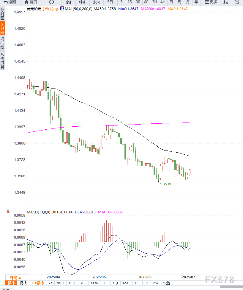 OPEC+在周六意外宣布8月起增产54.8万桶/日,引发市场对供需再度失衡的担忧。油价周一开盘即走弱,加拿大作为商品出口大国,其货币加元受油价拖累走低,成为USD/CAD反弹的直接推手。