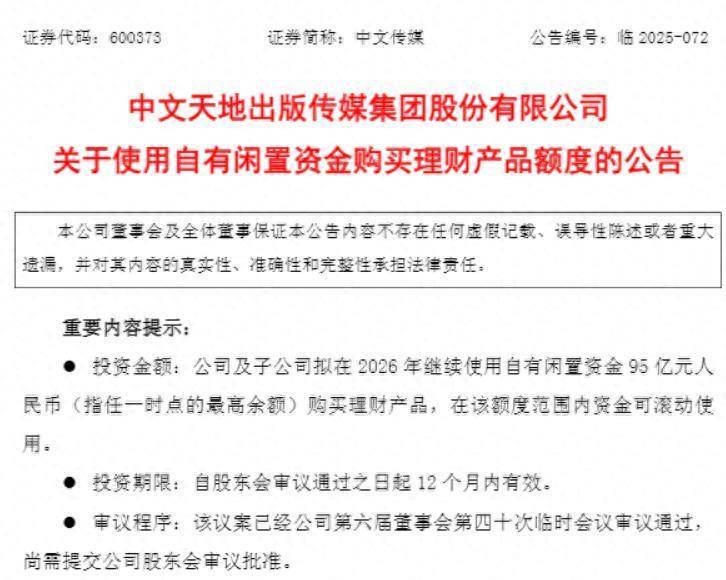 【大河财立方消息】11月18日,中文天地出版传媒集团股份有限公司(证券简称:中文传媒)发布公告称,董事会临时会议审议通过相关议案明福今投,公司及子公司拟在2026年继续使用自有闲置资金不超过95亿元(指任一时点的最高余额)购买理财产品。