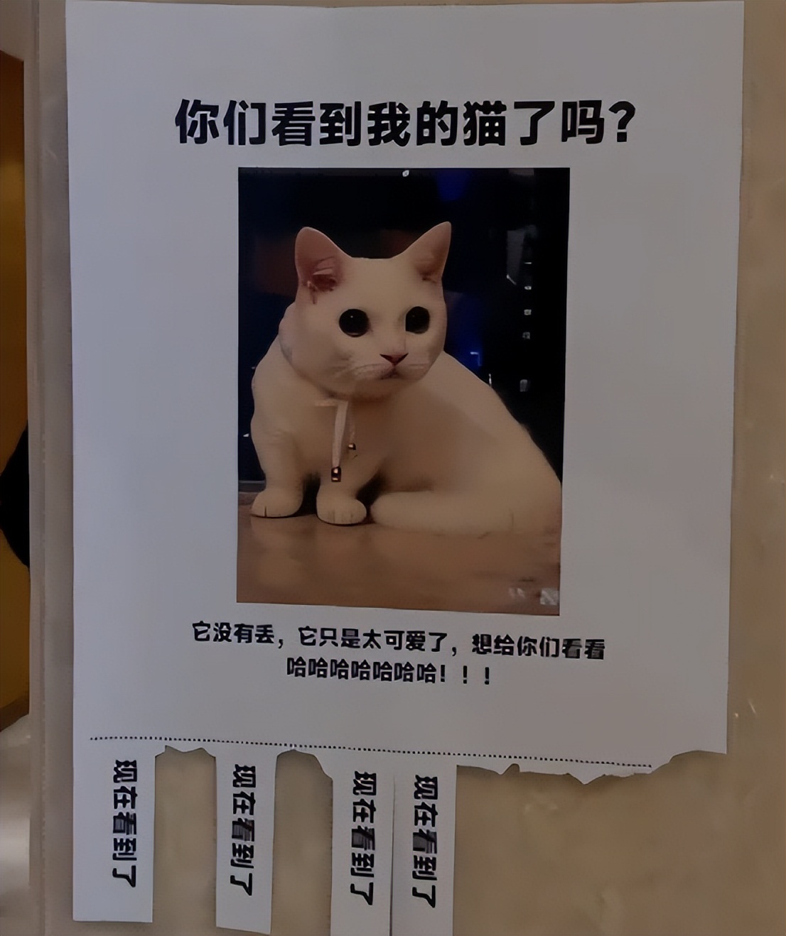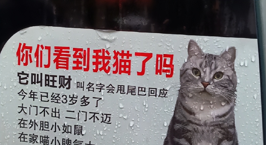 同样操作的还有这位铲屎官,他把猫咪的照片打印出来,贴在小区的楼道里。