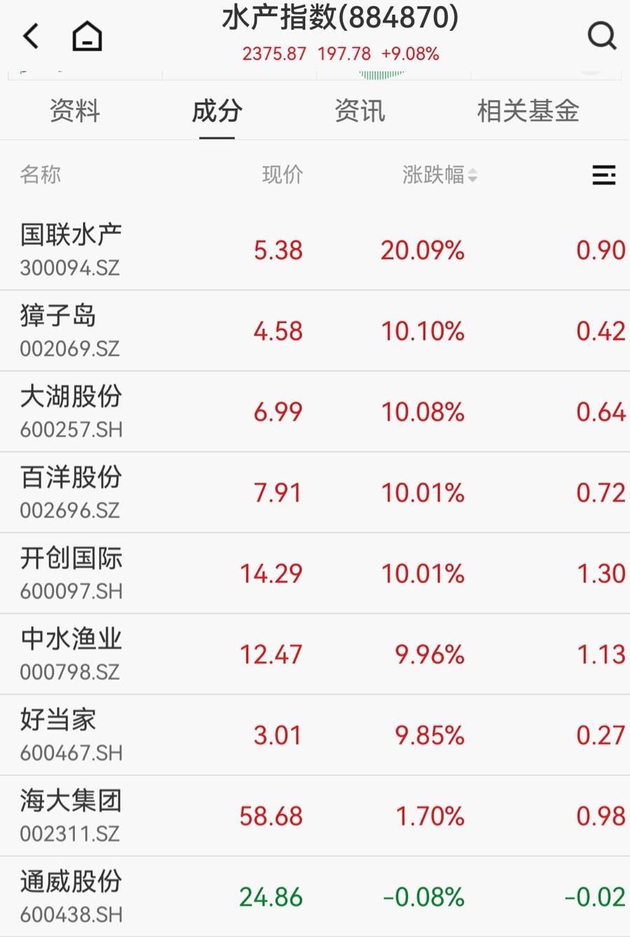 11月19日A 股午后交易时段,水产板块迎来全面爆发,多只核心个股集体拉升并封死涨停,成为当日资本市场中最受瞩目的板块之一。国联水产(300094.SZ)午后开盘即封死20%涨停板浩源配资,獐子岛(002069.SZ)、大湖股份(600257.SH)、中水渔业(000798.SZ)、开创国际(600097.SH)等多只水产股亦同步涨停。截至14时14分,Wind水产指数(884870)涨幅达9.08%。